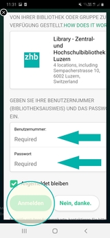 - Benutzernummer (> Nr. auf der Rückseite Ihres ZHB-Ausweises) und Passwort eingeben